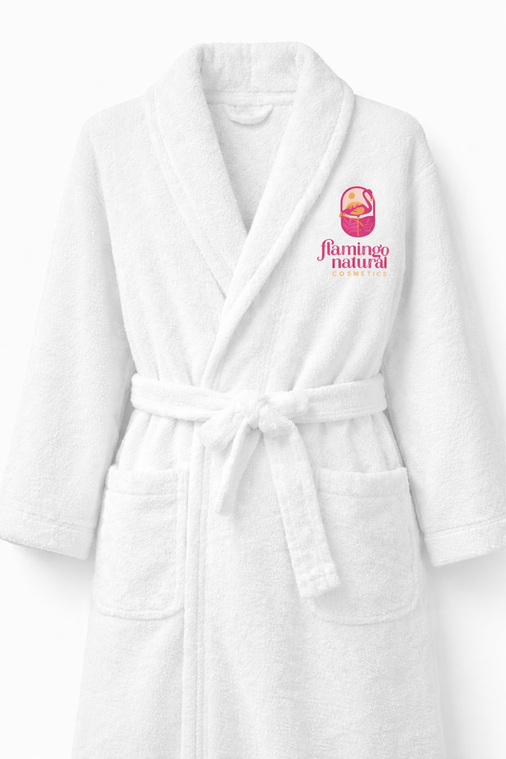 Designed with a classic shawl collar and long sleeves for added comfort and warmth, it features an elegantly embroidered Flamingo Natural logo on the chest, adding a refined and premium touch. The adjustable waist belt ensures a comfortable and flattering fit.
